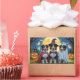 Uma cena divertida de Halloween, com um cachorrinho malicioso a espreitar-se de uma abóbora esculpida, rodeada por vibrações de outono assustadoras. Com um charme viscoso e cores de outono, é o toque perfeito de humor para a estação.