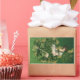 Ilustração de Vintage, feriado de saudações vitorianas do Dia de São Patrick. Uma senhora irlandesa está vestindo um vestido verde e branco sentado em um monte de pedras sortudas amarradas com fita, arco e cachimbo. Quatro capas de folha representam boa sorte. O texto diz "Rua. Souvenir no Dia de Patrick."