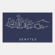Esta design apresenta um esboço desenhado manualmente do horizonte de Seattle sobre um fundo azul escuro.