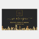 Um adesivo para promover a reabertura da limpeza da sua cidade ou qualquer negócio depois do Covid-19, o vírus da coroa. O fundo negro é uma linha do horizonte da cidade moderna abstrato em ouro falso. Personalize e adicione o logotipo, nome e site da sua empresa.