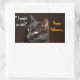 O gato preto viaja na noite de Halloween. Um adesivo divertido para a celebração do Dia das Bruxas