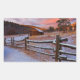 Esta foto mostra um celeiro rústico coberto de neve em frente a um lindo pôr do sol em um rancho no Colorado.