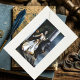 Uma feiticeira preta vestindo todo branco e ouro segurando seu funcionarios de dragão com uma mão e a outra tem as rédeas de um dragão preto. Os dois estão em um caminho de ponta com dois pilares atrás deles