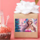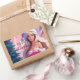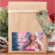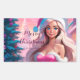 Ótima ilustração de uma linda garota de vestido cor-de-rosa e chapéu de Papai Noel com caixa de presentes perto da árvore de Natal. Escolha esta menina adorável em suítes de papais noeis cercadas pela magia atmosfera cristã para celebrar suas férias com alegria e um toque de magia. Também perfeito para receber cartas.