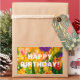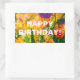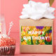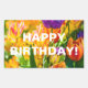 Tulipas coloridas num leito de flores. Todas as cores do arco-íris estão presentes. Bela e positiva cena floral. Vinheta retangular. Você pode mudar ou excluir o texto de modelo Feliz aniversário!
