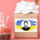 Parecem pintadas a bandeira azul e amarela da Ucrânia com uma imagem a preto e branco do Presidente da Ucrânia, Volodymyr Zelenskyy
