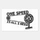 Um design divertido para pessoas que adoram andar de solteiro ou de moto fixo. Uma ilustração vetorial, em preto e branco, de um conjunto de cárteres de bicicleta. A corrente vai para um solteiro traseiro. O texto, a preto, lê Uma Velocidade É Tudo O Que Preciso.