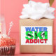 Para o viciado em esqui de água! Silhuetas pretas de calabouço, esquiadores de truques e saltos de água com o texto "viciado em esqui de água" em letras azuis, verdes e vermelhas.