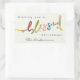 Este adesivo de saudação de Natal apresenta a palavra colorida e pintada à mão "abençoada" com belos detalhes artísticos. Faz parte de uma coleção correspondente de cartões de saudação de fotos de Natal, adesivos, etiquetas de endereço e devolução, bem como ornamentos.