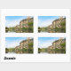 Um autocolante retangular de fotografia do castelo e da aldeia de Beynac-et-Cazenac construída sobre os penhascos ao lado do rio Dordogne, no início da manhã, com reflexo no rio e um caiaque no primeiro plano. A cidade está situada no perigor, na França.