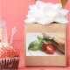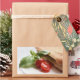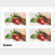 Um autocolante de fotografia retangular com uma comida italiana saudável, constituída por uma sanduíche panini e um tomate, folhas de manjericão verde e queijo mozzarella, em fundo branco.
