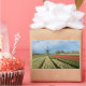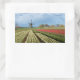 Vinheta-foto retangular de uma paisagem com moinho de vento e tulipas amarelas e vermelhas sob um céu nublado no campo holandês, num belo dia de primavera na Região do Bulb, Países Baixos.