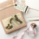 Este adesivo de Natal / Feriado tem 4 cães dachshund brincando ao redor de um vaso e bagas ocas no fundo.