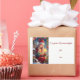 Ein freundliches kleines Mädchen mit einem kleinen Geschenk in der Hand bestellt viele Grüße zum Fest.