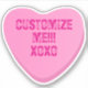 Put your own spin on a retro classic with these personalized pink candy heart stickers! Whether you want to add names, fun phrases for your valentine, galentine, bestie, sweet heart, or inside jokes, this design allows you to create custom text stickers with a trendy Y2K aesthetic. Printed on durable, high-performance vinyl, these stickers are perfect for personalizing your laptop, water bottle, phone case, or even your car with a pop of pink. Available in five sizes from tiny to huge! Use the design tool to add any text or phrases to the hearts—perfect for party favors, branding, or gift sealing. Premium Vinyl Quality: Choose from matte white, glossy white, or a transparent finish for a "stamped" look.