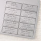 Folha de adesivos transparente com endereços individuais, adequada para envio pelo correio.