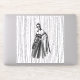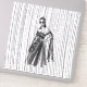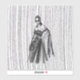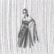 Esta é uma ilustração na moda a preto-e-branco que apresenta uma mulher envenenada num vestido dramático, fora do ombro, com embelezamentos florais intrincados e uma capa brilhante e fluente. O fundo tem uma textura vertical impressionante, acrescentando uma sensação de profundidade e movimento