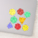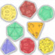 Esta folha contém 8 adesivos diferentes do estilo die que retratam diferentes jogos de fantasia ou jogos de papel em amarelo, vermelho, verde, laranja e roxo com ilustrações de dados de 12 lados, 20 lados e 4 lados.