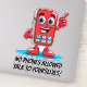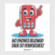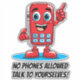 O adesivo sem telefones celulares vermelhos permitidos tem uma ilustração humorística com um celular vermelho brilhante sorrindo e apontando seu dedo. Abaixo está um texto que diz "nenhum telefone permite falar consigo mesmo", encorajando as pessoas a falar entre si e desencorajando o uso de telefones enquanto dirigem.