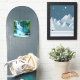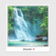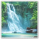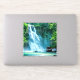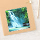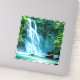 Vinheta, ilustrada por uma cascata de cascata de azul pálido com spray branco, rodeada de pedras e folhas verdes