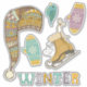 Um design de inverno bonito, com skates de gelo, e um boné longo com pom. Diz o inverno em uma fonte colorida e caprichosa. Em cores de chalé, ouro, roxo e branco. Um design de colagem de inverno bonito.
