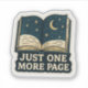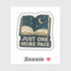 Adote os seus hábitos de leitura à noite com este adesivo encantador de "Só Mais Uma Página"! Apresentando um livro aberto revelando um céu noturno celeste com lua crescente e estrelas cintilantes, esse decal de vinilo durável captura perfeitamente o irresistível prazer de se perder numa boa história. É um acessório ideal para laptop, e-readers, garrafas d'água, notebooks, ou qualquer superfície onde você queira mostrar sua paixão pela leitura e a magia da narrativa de histórias sob as estrelas.