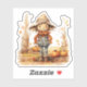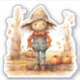 Um adesivo de queda livre com um espantalho sorridente e abóboras e folhas coloridas de outono.