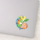 Este vinil tem um lagarto brilhante e colorido em verde, azul, laranja e amarelo com olhos grandes segurando um galho com uma folha verde.