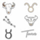 A Taurus está representada na astrologia como o Bull e é mostrada aqui como símbolos numa página personalizada de vinil autocolante com seis imagens diferentes. Desenhos de cor e de linha desenhados à mão, símbolos em preto e ouro, uma constelação negra de estrelas e texto de Taurus com uma fabulosa letra manuscrita.