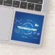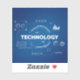 Um adesivo de arte digital com fundo azul e gráficos brancos. A palavra "TECNOLOGIA" aparece de forma destacada no centro, rodeada por uma linha pontilhada circular. Por cima e por baixo, encontram-se os códigos binários "01101" e "10101", respectivamente. O adesivo apresenta vários desenhos brancos, incluindo um quadrado com dois círculos de dentro, um padrão de grade, um gráfico de bar, dois círculos concêntricos e um cubo. Os números "01" a "04" são ordenados numa linha na parte superior e "05" a "08" estão na parte inferior.
