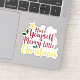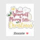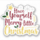 Tenha um Natal Feliz em uma letra decorativa de escrita cursiva em vermelho profundo e ouro. Embelado com uma estrela, flocos de neve, holly e um galho de agulhas verdes.