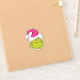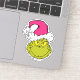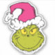 This fantastic, bold illustration is a close-up portrait of the Grinch in full mischievous mode! He has his signature sly grin and bright yellow eyes, but his look is updated with a large, fluffy Santa hat in a fun, unexpected pink/fuchsia color instead of the traditional red. This graphic is perfect for anyone who loves the holidays but embraces a non-traditional, delightfully grumpy, and colorful style!
