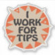 Trabalho para o botão Dicas para ajudar a espalhar a Consciência das Dicas e lembrar as pessoas de dar dicas de uma forma divertida e amigável. Para pessoas que trabalham em restaurantes, entretenimento, transporte ou qualquer serviço que dependa de dicas. Com estrelas e rajadas, fundo laranja e uma fonte retrô divertida.