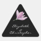 Adesivos de triângulo personalizados com uma bela magnólia roxa florescendo aquarela e o seu texto em letras brancas chicas sobre fundo preto, perfeito para favores de festa de casamento, chá de panela, selos de convite para casamento e muito mais. Disponível em diferentes formas. CORRESPONDENTE A ITENS na nossa loja.