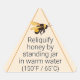 Rótulo de frasco de mel com abelha de mel e recomendações para o regresso suave do mel ao estado líquido após cristalização (solidificação): "Alinhem o mel colocando o frasco em água quente (150°F / 65°C)". Colar adesivos na tampa superior ou lateral dos frascos de vidro para mason, garrafas plásticas para espremer e outros recipientes de mel. Encontre os fatos de nutrição do mel e adesivos de aviso de criança na coleção.