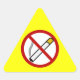 Sem fumo, adesivo anti-fumante com círculo clássico de "derrame/proibição" sobreposto a um cigarro aceso, aninhado num triângulo amarelo. O triângulo amarelo traz à mente advertências de perigo biológico e imagens e conotando as qualidades biomoperigosas do tabagismo.