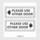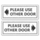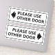 Procurando uma maneira educada de dirigir o tráfego de pés em sua empresa? Não olhe mais que este sinal branco "Por favor, use outra porta" com um adesivo de vinilo de seta definido! Estes autocolantes versáteis podem ser colocados em qualquer porta ou janela e devem transmitir a sua mensagem sem qualquer confusão. O texto preto claro e a seta são fáceis de ver, mesmo à distância. As mensagens neste conjunto de adesivos podem ser personalizadas.