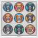 Uma vibrante coleção de ilustrações em estilo de vitral mostrando várias raças de cães, cada uma apresentada como retratos únicos dentro de molduras circulares, destacando detalhes artísticos e charme decorativo.