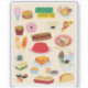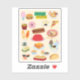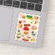 Uma arte vetorial de diferentes variedades de comida, como algodão doce, hambúrguer, camarão frito, gyoza, pizza, batata frita, cachorro-quente, donut, corndogs, geleia, ramen, lasanha, sundae, sorvete, muffin, nachos, mochi, sushi, sanduíche, bolinho de arroz e taco.