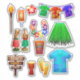 Uma coleção de viciados tropicais de verão do Hwaiin luau. Incluindo a tocha de tiki, as camisas havaianas, chinelos, hibiscus lei e muito mais.
