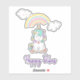 Um decal de vinilo com uma ilustração de unicórnio branco. Sentada com os olhos fechados e um pouco de coração vermelho no centro do seu peito. O rico e a cauda dela são encaracolados e bonitos em cores pastéis. Um arco-íris acima com nuvens. Feliz Vibes escrito abaixo.