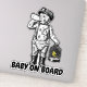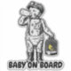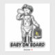 Funny Baby on Board sticker featuring a funny Victorian baby image. The cute Victorian baby is carrying his miner's canary in a cage, drinking his milk from a bottle and is wearing a flat cap with a miner's lamp on it. He also has braces on his nappy or diaper, if that's what you prefer. This funny Baby on Board sticker is for all parents who have a sense of humour and a baby who is already wearing flat caps.