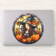 Esse vinheta sazonal de grande porte apresenta uma bruxa bonito com abóboras e folhas de outono em uma rodada de "vidro manchado". Imagem digital criada com ajuda da IA.