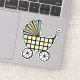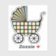 Dê um passeio com este pram estilizado e divertido decorado com listras brilhantes rosa, laranja, verde e azul no cobrir e um padrão que lembra os blocos de madeira no corpo.