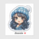 Um belo adesivo de férias mostra um personagem encantador, adornada com um chapéu azul e suéter aconchegantes, pronto para celebrar o Natal. Flocos de neve espumantes cercam-na, evocando a magia das festividades de inverno e o espírito de feriado alegre.