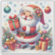 Um Papai Noel alegre fica em meio a um colorido pano de fundo, segurando um presente maravilhosamente embrulhado.