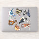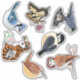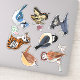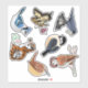 Uma seleção de aves e animais gráficos, reproduzida a partir das minhas próprias ilustrações originais. Um raven sobre o crânio com uma chave, um tigre bebê e uma borboleta, um jay azul, uma varinha de colina preta, uma coruja de celeiro cardíaco, e uma borboleta de cauda-andorinha e flores cor-de-rosa.