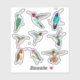 Esta coleção de adesivos de beija-flor apresenta várias espécies fofinhas de beija-flor que podem ser encontradas nos EUA, por exemplo, uma fêmea de beija-flor-garganta-rubi, beija-flores de Anna, um beija-flor-de-bico-largo, Allen's, Rufous e macho de beija-flores com garganta-rubi. Todas as imagens são tiradas de ilustrações originais de aquarelas por C. Dobbins.