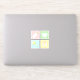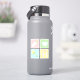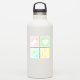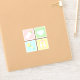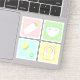 Quatro quadrados em pastéis macios de cor rosa, verde, azul e amarelo são emoldurados por um design branco como marcas de pontos e decorados com ícones fofinhos, com tema para bebês, de uma garrafa, fralda, chocalho e bib.