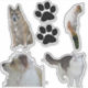 Gatos e Cães com pegadas. Dois gatos diferentes, dois cães diferentes e duas pata imprimem silhuetas.